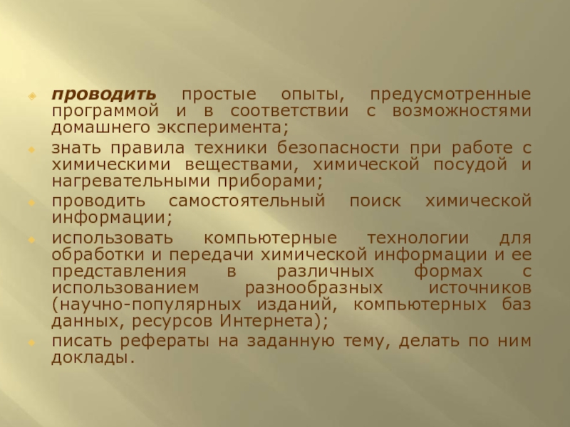 Слайд 7проводить простые опыты, предусмотренные программой и в соответствии с возможностями домашнего