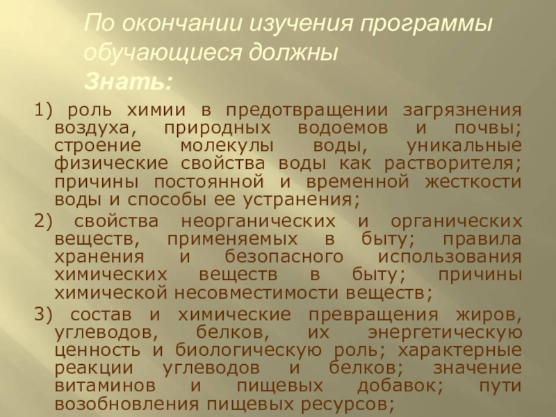 2) свойства неорганических и органических веществ, применяемых в быту; правила хранения и безопасного использования химических веществ в быту; причины химической несовместимости веществ;