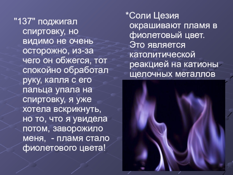 *Соли Цезия окрашивают пламя в фиолетовый цвет. Это является католитической реакцией на катионы щелочных металлов