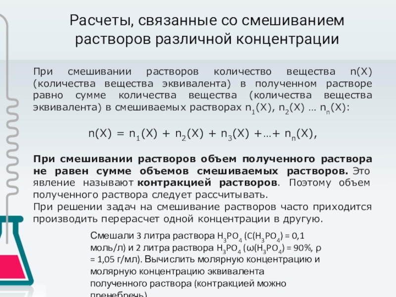 4. Смешали 3 литра раствора H3PO4 (C(H3PO4) = 0,1 моль/л) и 2 литра раствора H3PO4 (ω(H3PO4) = 90%, ρ = 1,05 г/мл). Вычислить молярную концентрацию и молярную концентрацию эквивалента полученного раствора (контракцией можно пренебречь).