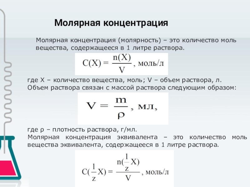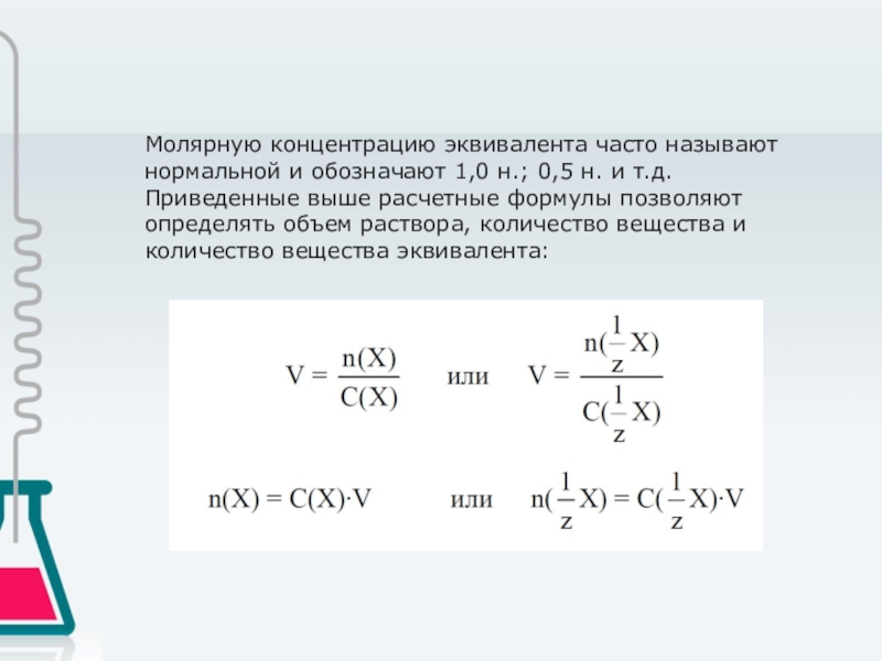 Молярная концентрация эквивалента – это количество моль вещества эквивалента, содержащееся в 1 литре раствора.