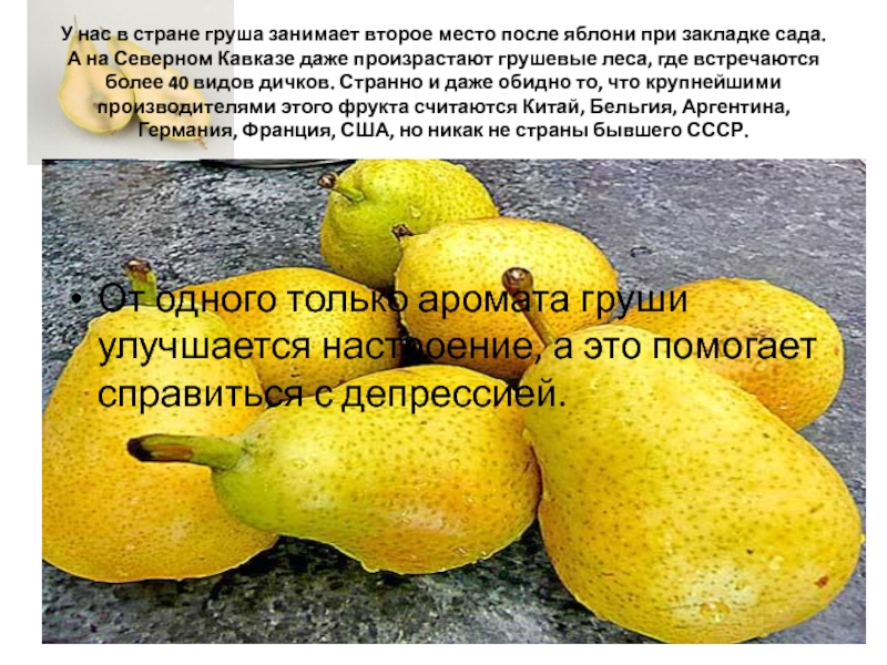 От одного только аромата груши улучшается настроение, а это помогает справиться с депрессией.