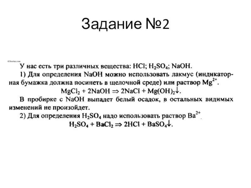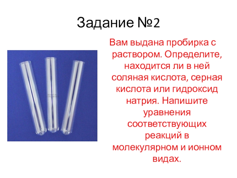 Задание №2Вам выдана пробирка с раствором. Определите, находится ли в ней соляная кислота, серная кислота или гидроксид