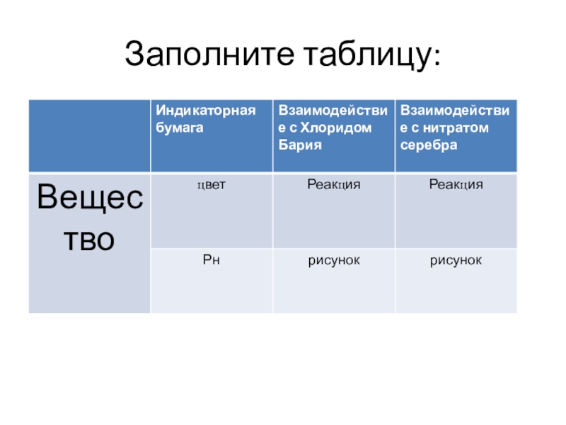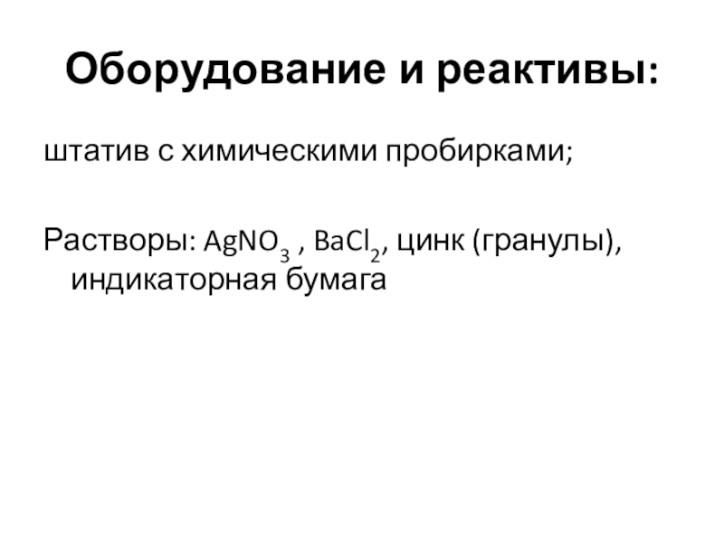 Оборудование и реактивы:штатив с химическими пробирками; Растворы: AgNO3 , BaCl2, цинк (гранулы), индикаторная бумага