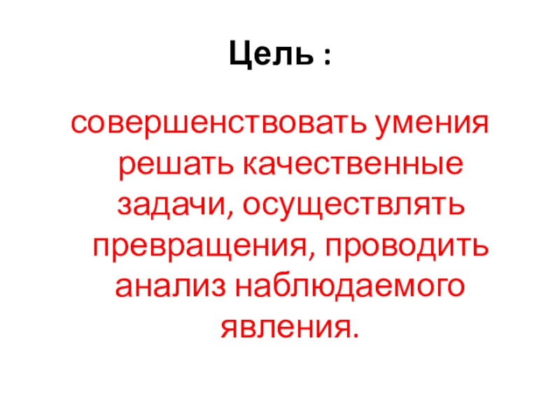 Цель : совершенствовать умения решать качественные задачи, осуществлять превращения, проводить анализ наблюдаемого явления.