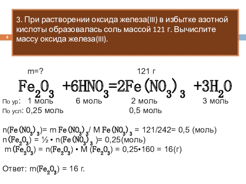 n(Fe(NO3)3)= m Fe(NO3)3/ М Fe(NO3)3 = 121/242= 0,5 (моль)