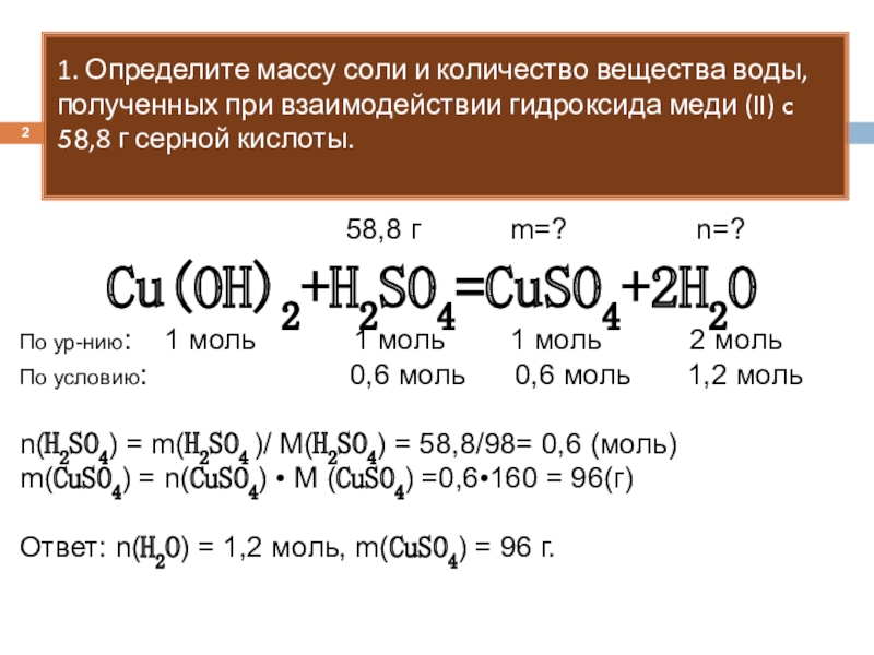 1. Определите массу соли и количество вещества воды, полученных при взаимодействии гидроксида меди (II) c 58,8 г серной кислоты.