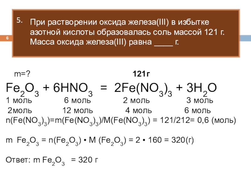 При растворении оксида железа(III) в избытке азотной кислоты образовалась соль массой 121 г. Масса оксида железа(III) равна ____ г.