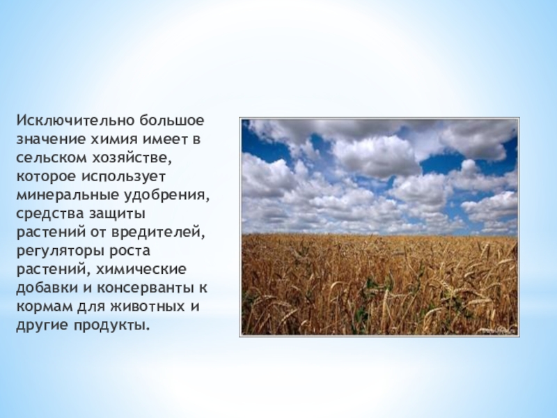 Слайд 6Исключительно большое значение химия имеет в сельском хозяйстве, которое использует минеральные