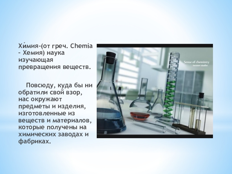 Хи́мия-(от греч. Chemia – Хемия) наука изучающая превращения веществ. Повсюду, куда бы ни обратили свой взор, нас окружают предметы и изделия, изготовленные из веществ и материалов, которые получены на химических заводах и фабриках.
