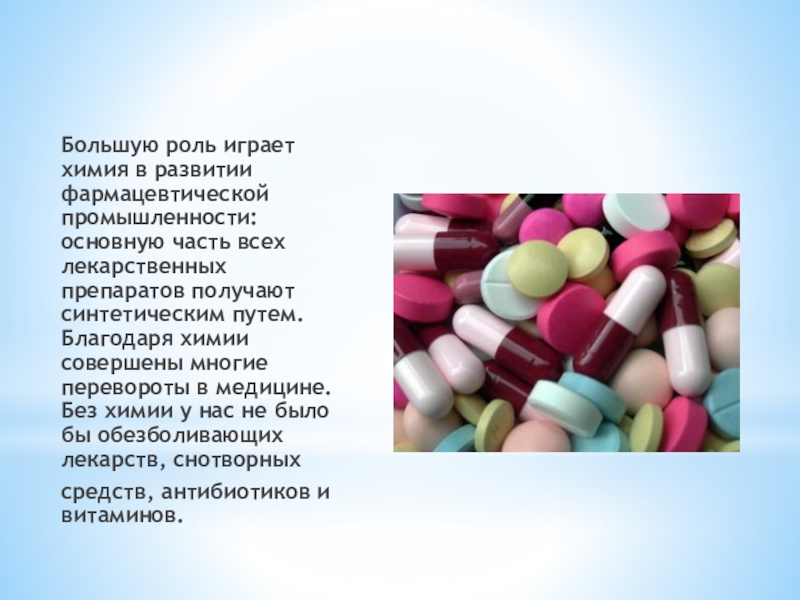 Слайд 5Большую роль играет химия в развитии фармацевтической промышленности: основную часть всех