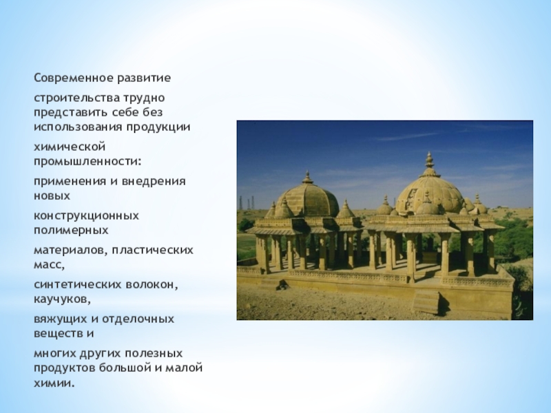 Современное развитиестроительства трудно представить себе без использования продукциихимической промышленности:применения и внедрения новыхконструкционных полимерныхматериалов, пластических масс,синтетических волокон, каучуков,вяжущих