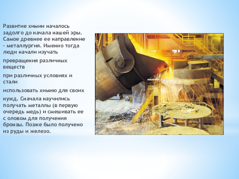 Развитие химии началось задолго до начала нашей эры. Самое древнее ее направление – металлургия. Именно тогда люди