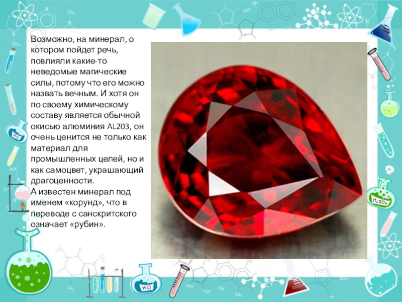 силы, потому что его можно назвать вечным. И хотя он по своему химическому составу является обычной окисью алюминия AL203, он очень ценится не только как материал для промышленных целей, но и как самоцвет, украшающий драгоценности.