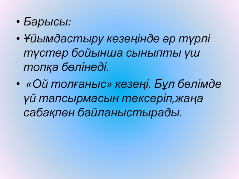 Ұйымдастыру кезеңінде әр түрлі түстер бойынша сыныпты үш топқа бөлінеді.