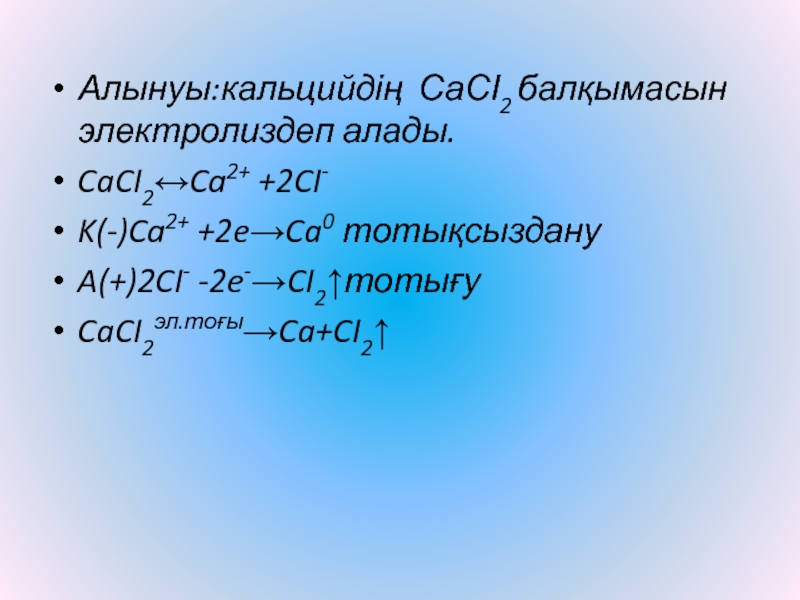Слайд 13Алынуы:кальцийдің СаСІ2 балқымасын электролиздеп алады.
