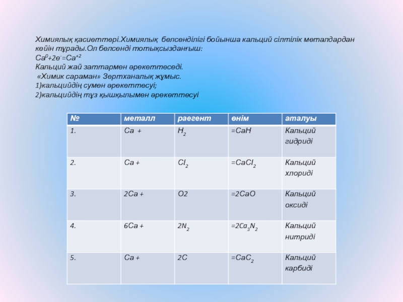 Слайд 15Химиялық қасиеттері.Химиялық белсенділігі бойынша кальций сілтілік металдардан кейін тұрады.Ол белсенді тотықсызданғыш: