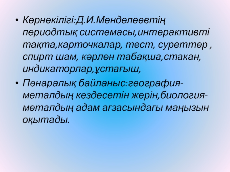 Слайд 4Көрнекілігі:Д.И.Менделеевтің периодтық системасы,интерактивті тақта,карточкалар, тест, суреттер ,спирт шам, кәрлен табақша,стакан, индикаторлар,ұстағыш,