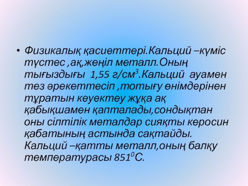 Слайд 14Физикалық қасиеттері.Кальций –күміс түстес ,ақ,жеңіл металл.Оның тығыздығы 1,55 г/см3.Кальций ауамен тез
