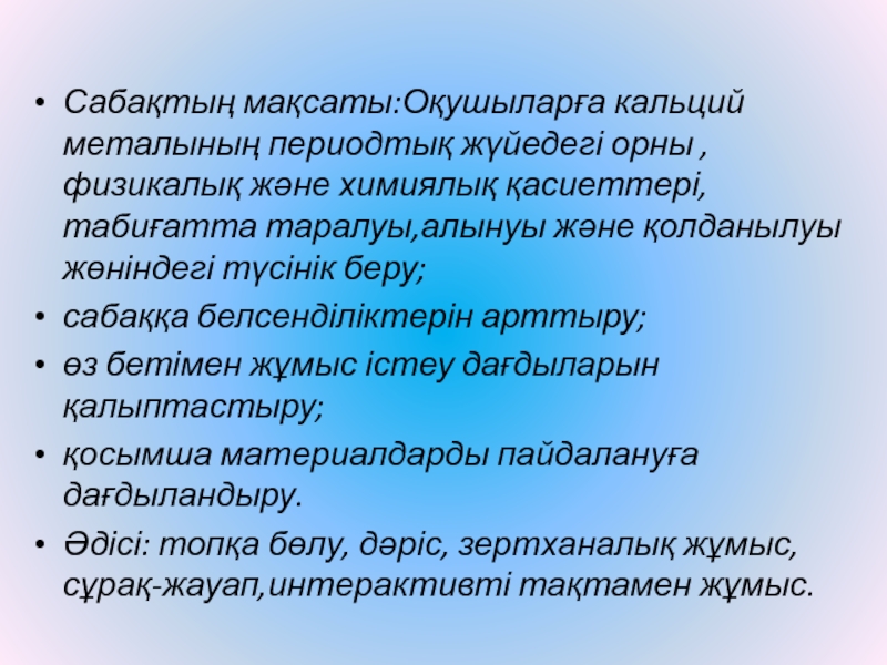 Слайд 3Сабақтың мақсаты:Оқушыларға кальций металының периодтық жүйедегі орны ,физикалық және химиялық қасиеттері,