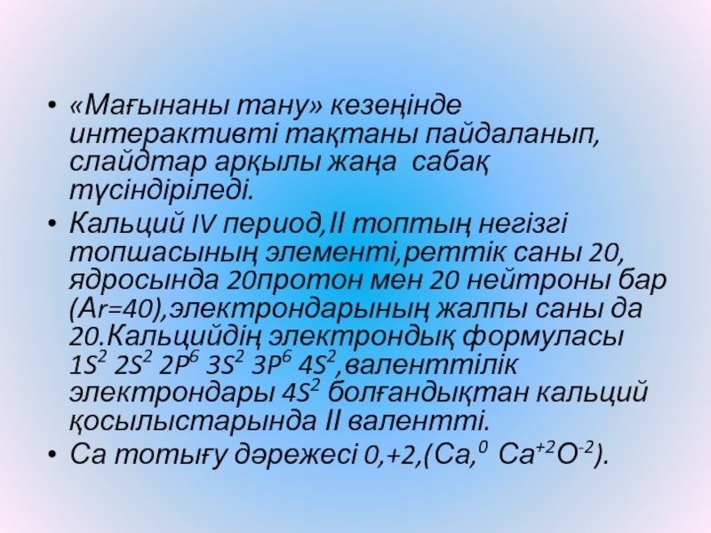 «Кальций дің периодтық жүйедегі орны, атом құрылысы, қасиеттері»
