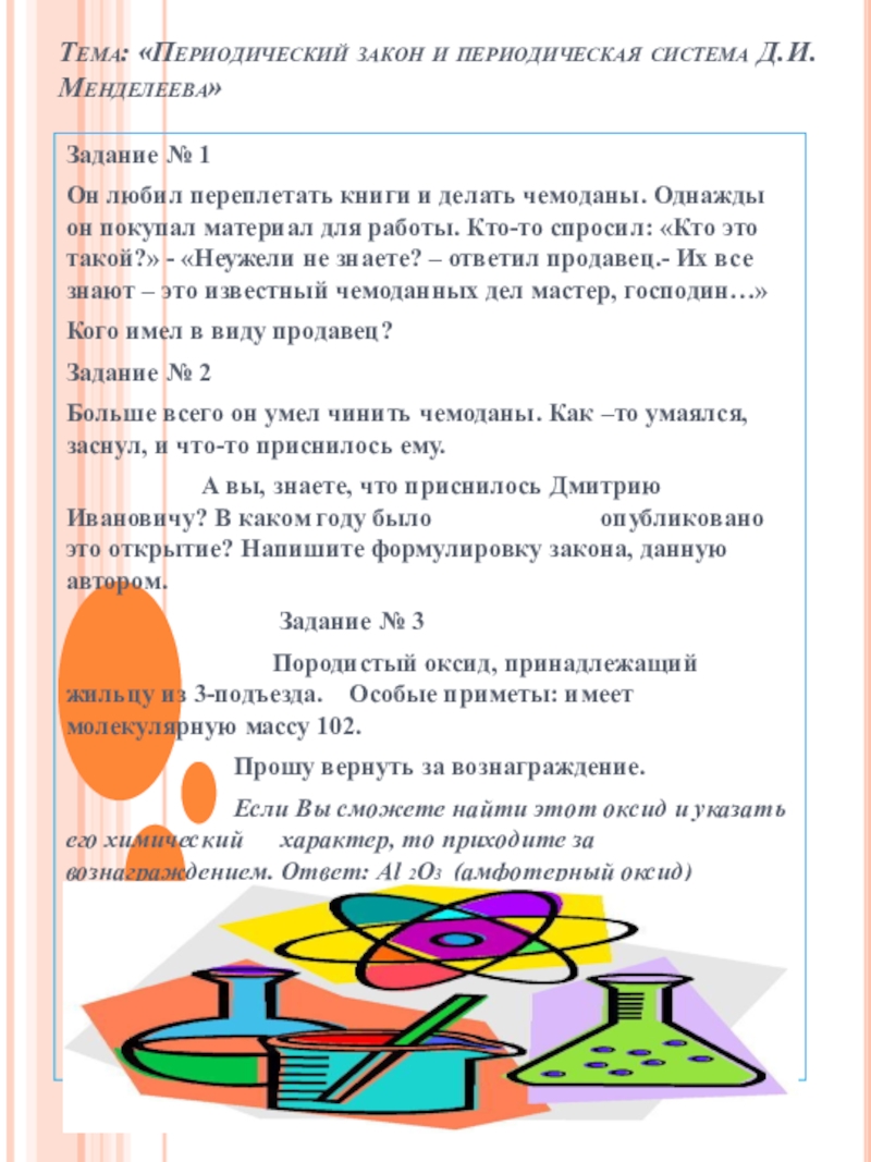 Слайд 2Тема: «Периодический закон и периодическая система Д.И.Менделеева»