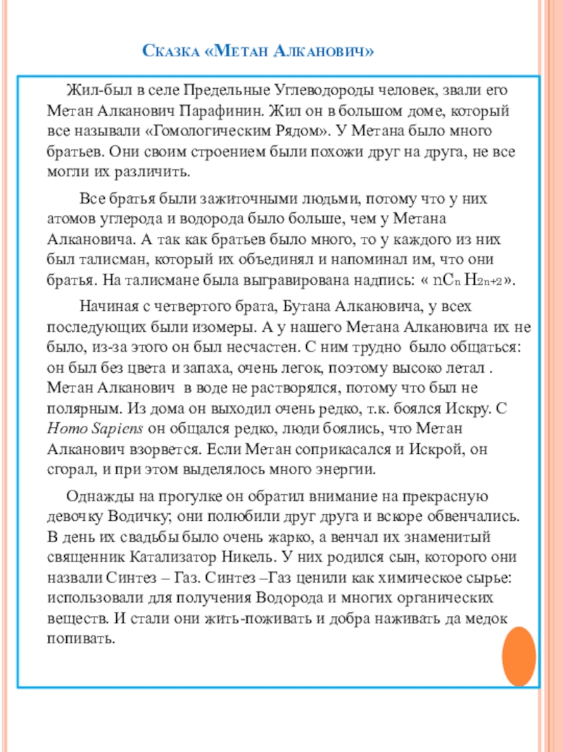 Начиная с четвертого брата, Бутана Алкановича, у всех последующих были изомеры. А у нашего Метана Алкановича их не было, из-за этого он был несчастен. С ним трудно было общаться: он был без цвета и запаха, очень легок, поэтому высоко летал . Метан Алканович в воде не растворялся, потому что был не полярным. Из дома он выходил очень редко, т.к. боялся Искру. С Homo Sapiens он общался редко, люди боялись, что Метан Алканович взорвется. Если Метан соприкасался и Искрой, он сгорал, и при этом выделялось много энергии.