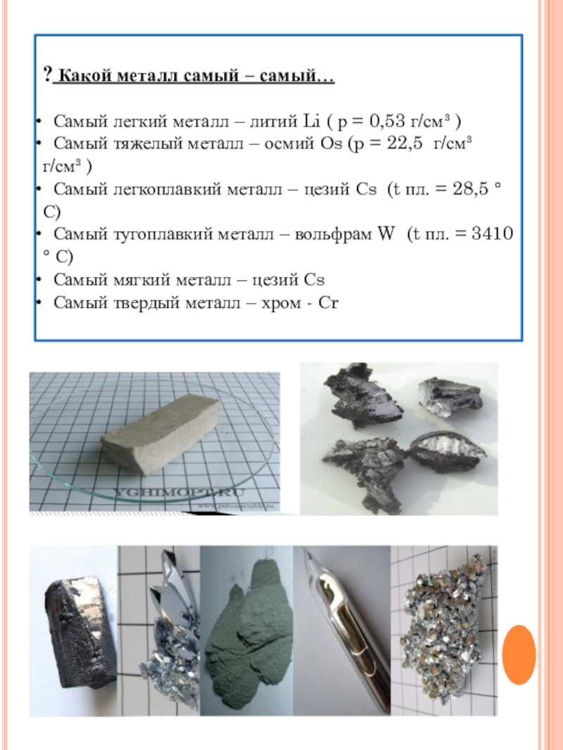 Самый тяжелый металл – осмий Оs (p = 22,5 г/см³ г/см³ )