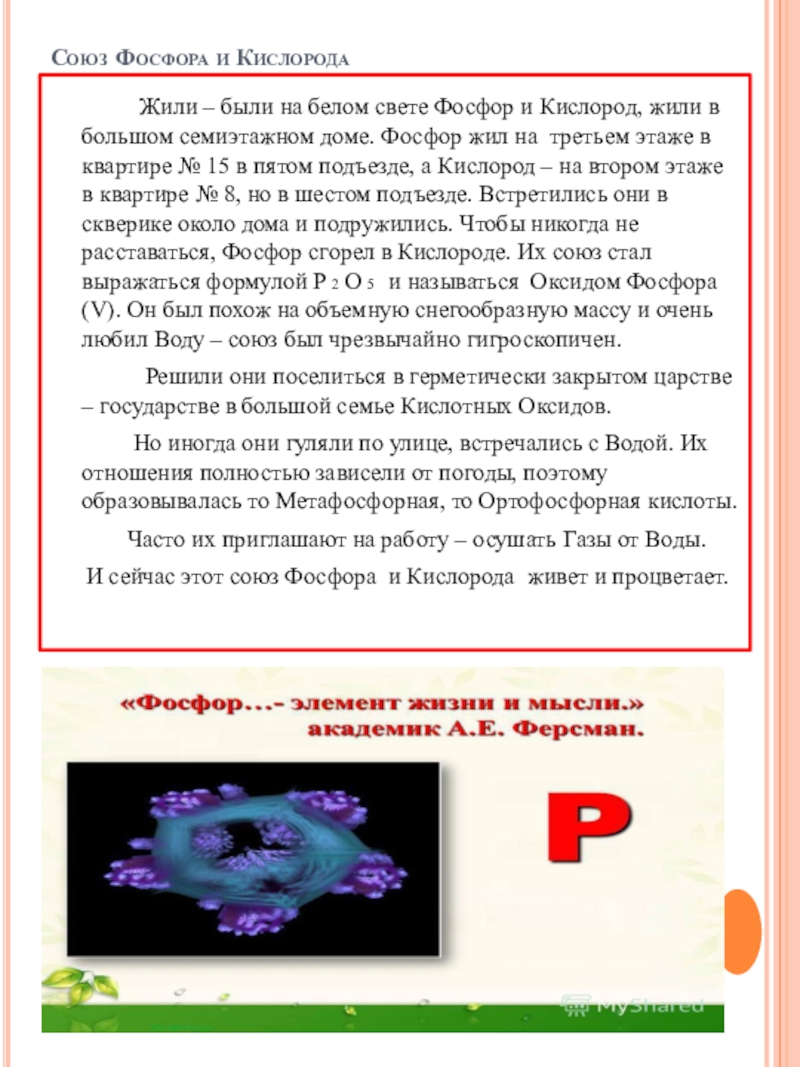 – были на белом свете Фосфор и Кислород, жили в большом семиэтажном доме. Фосфор жил на третьем этаже в квартире № 15 в пятом подъезде, а Кислород – на втором этаже в квартире № 8, но в шестом подъезде. Встретились они в скверике около дома и подружились. Чтобы никогда не расставаться, Фосфор сгорел в Кислороде. Их союз стал выражаться формулой P 2 O 5 и называться Оксидом Фосфора (V). Он был похож на объемную снегообразную массу и очень любил Воду – союз был чрезвычайно гигроскопичен.