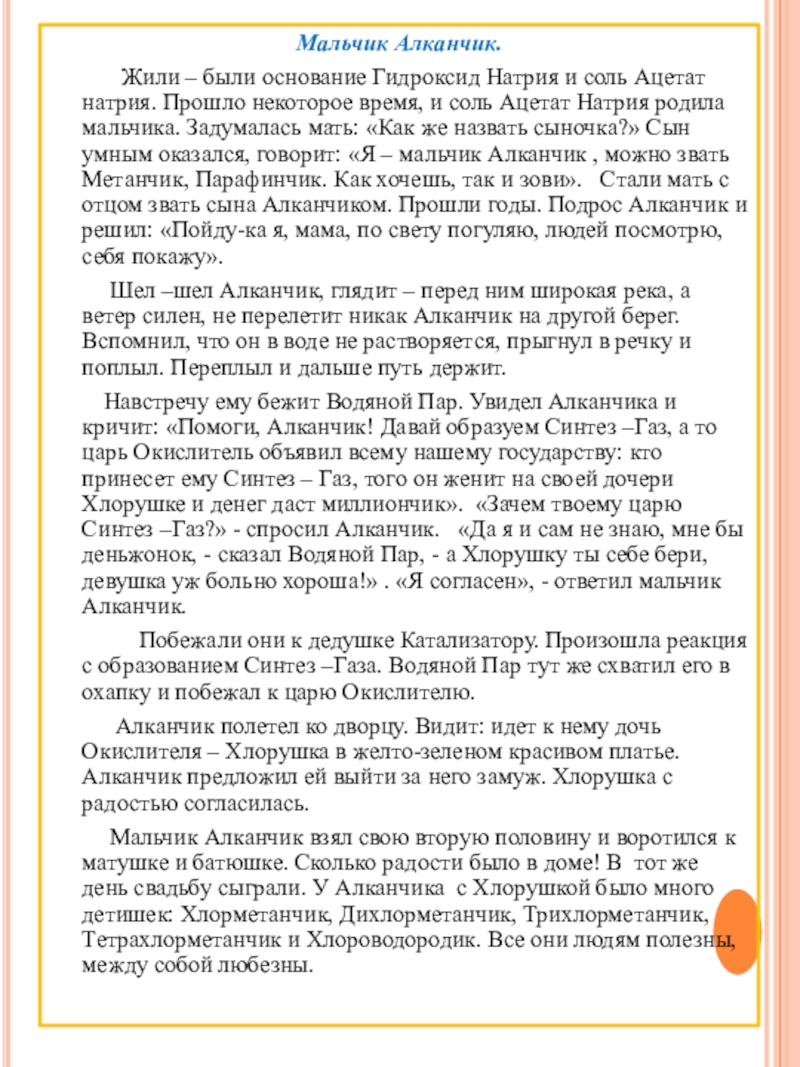 Гидроксид Натрия и соль Ацетат натрия. Прошло некоторое время, и соль Ацетат Натрия родила мальчика. Задумалась мать: «Как же назвать сыночка?» Сын умным оказался, говорит: «Я – мальчик Алканчик , можно звать Метанчик, Парафинчик. Как хочешь, так и зови». Стали мать с отцом звать сына Алканчиком. Прошли годы. Подрос Алканчик и решил: «Пойду-ка я, мама, по свету погуляю, людей посмотрю, себя покажу».