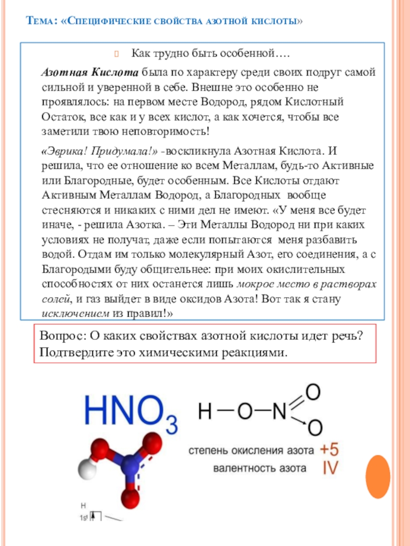 Слайд 5Тема: «Специфические свойства азотной кислоты»