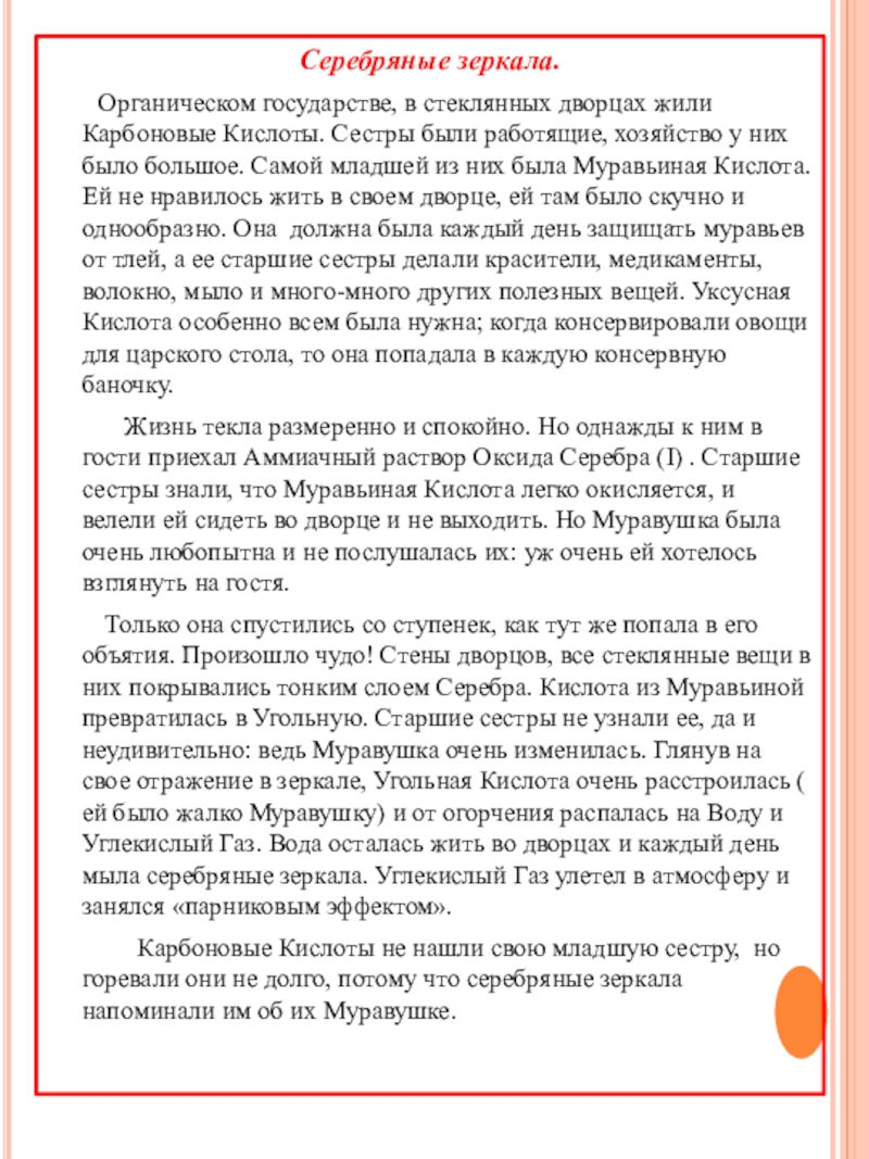 Только она спустились со ступенек, как тут же попала в его объятия. Произошло чудо! Стены дворцов, все стеклянные вещи в них покрывались тонким слоем Серебра. Кислота из Муравьиной превратилась в Угольную. Старшие сестры не узнали ее, да и неудивительно: ведь Муравушка очень изменилась. Глянув на свое отражение в зеркале, Угольная Кислота очень расстроилась ( ей было жалко Муравушку) и от огорчения распалась на Воду и Углекислый Газ. Вода осталась жить во дворцах и каждый день мыла серебряные зеркала. Углекислый Газ улетел в атмосферу и занялся «парниковым эффектом».