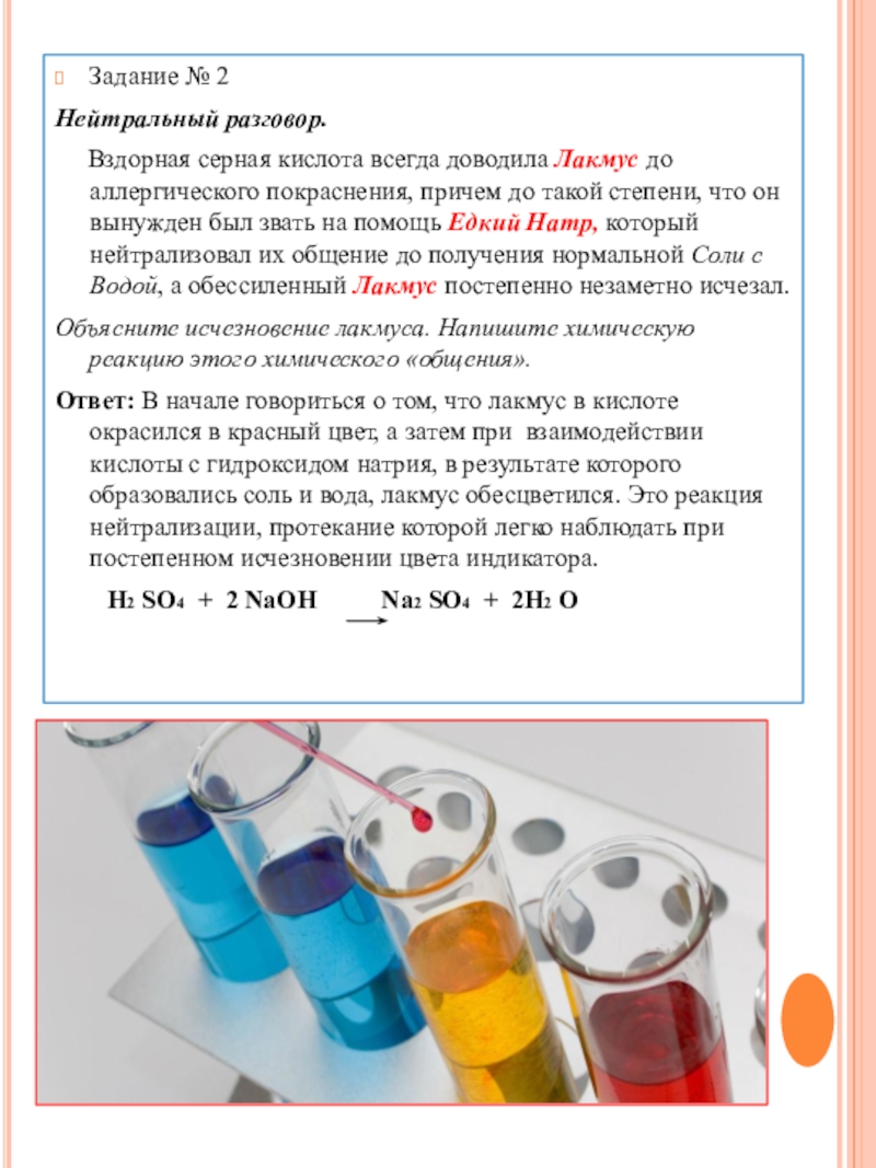 Ответ: В начале говориться о том, что лакмус в кислоте окрасился в красный цвет, а затем при взаимодействии кислоты с гидроксидом натрия, в результате которого образовались соль и вода, лакмус обесцветился. Это реакция нейтрализации, протекание которой легко наблюдать при постепенном исчезновении цвета индикатора.