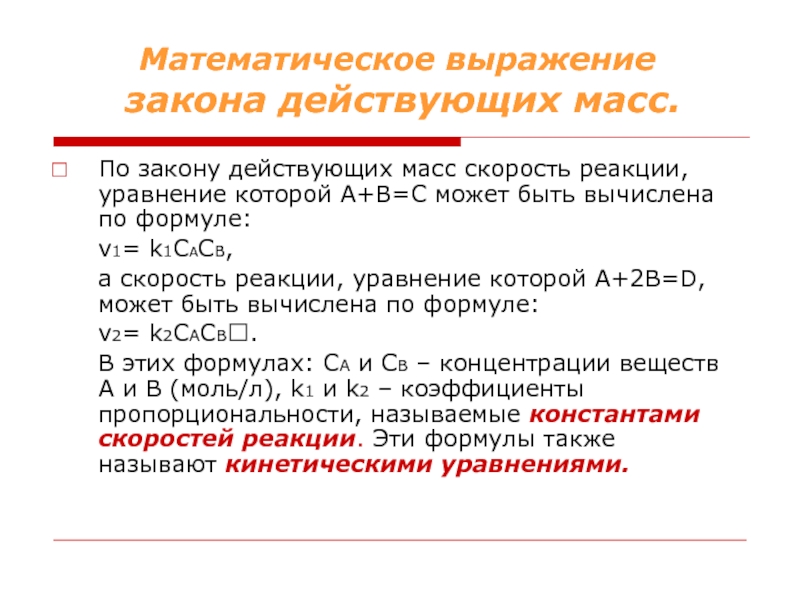 норвежские учёные К. Гульдберг, и П Вааге и независимо от них в 1865 г. русский учёный Н.И. Бекетов сформулировали основной закон химической кинетики, устанавливающий зависимость скорости реакции от концентраций реагирующих веществ: