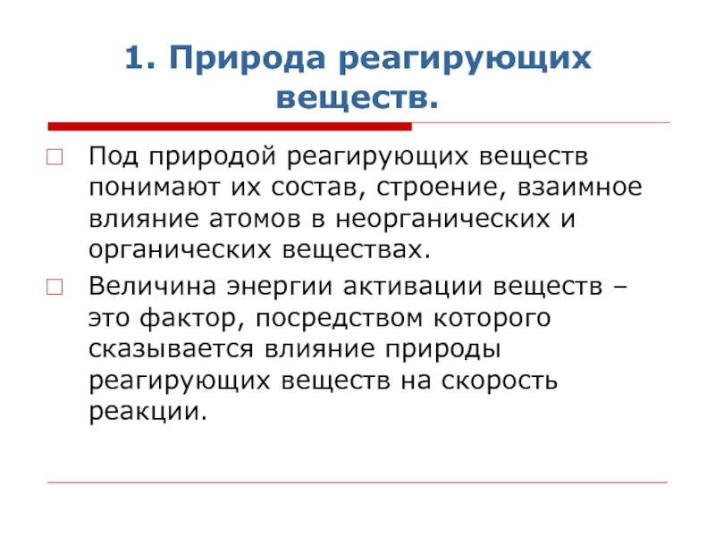 Величина энергии активации веществ – это фактор, посредством которого сказывается влияние природы реагирующих веществ на скорость реакции.