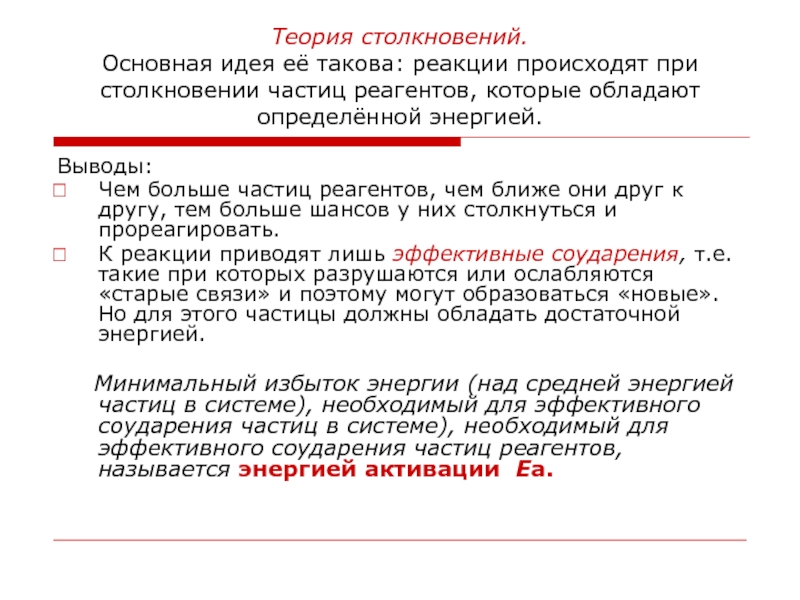 К реакции приводят лишь эффективные соударения, т.е. такие при которых разрушаются или ослабляются «старые связи» и поэтому могут образоваться «новые». Но для этого частицы должны обладать достаточной энергией.