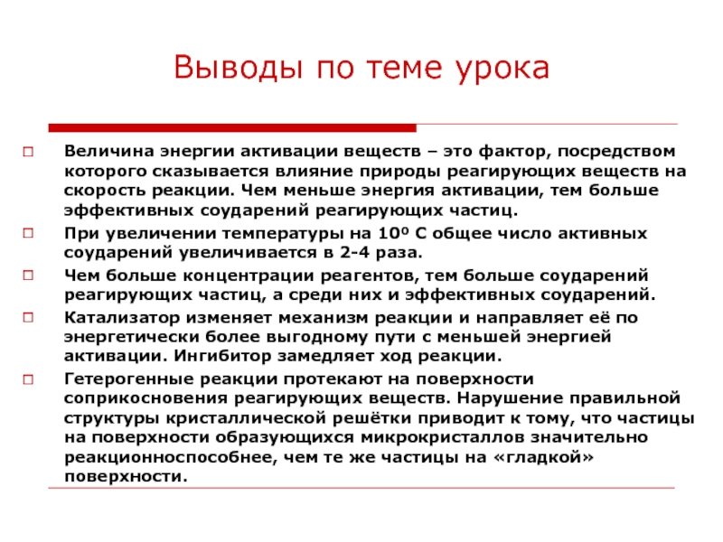 которого сказывается влияние природы реагирующих веществ на скорость реакции. Чем меньше энергия активации, тем больше эффективных соударений реагирующих частиц.