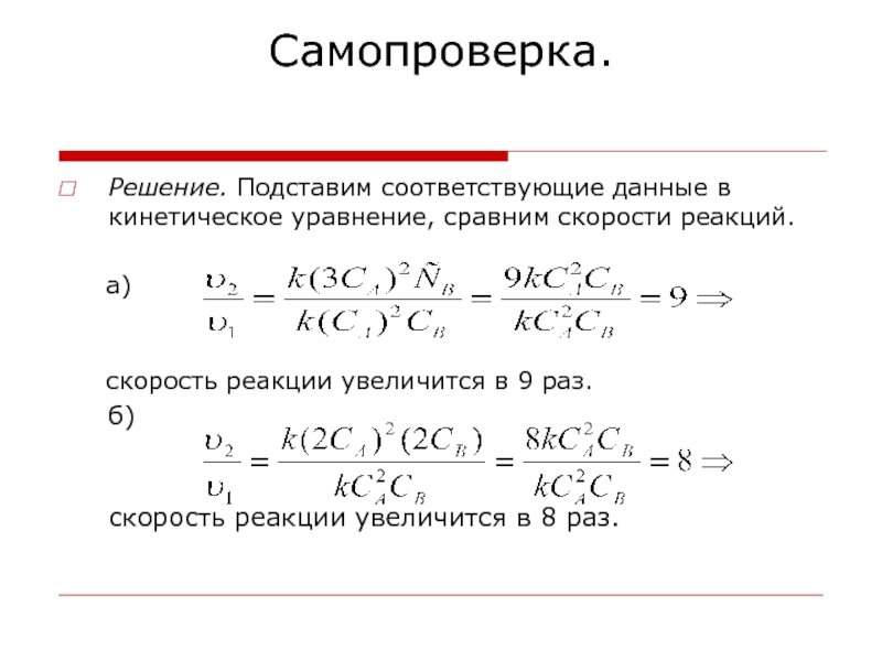 Решение. Подставим соответствующие данные в кинетическое уравнение, сравним скорости реакций.