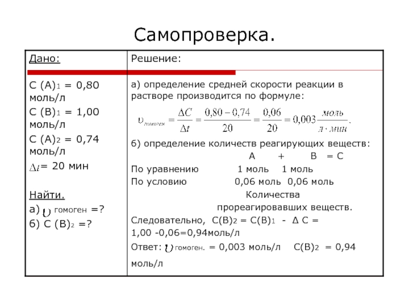 растворе, согласно уравнению: А+В = С. Исходные концентрации: вещества А – 0,80 моль/л, вещества В – 1,00 моль/л. Через 20 минут концентрация вещества А снизилась до 0, 74 моль/л. Определите: а) среднюю скорость реакции за этот промежуток времени;