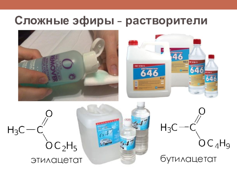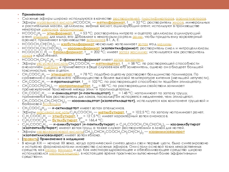 Сложные эфиры широко используются в качестве растворителей, пластификаторов, ароматизаторов.