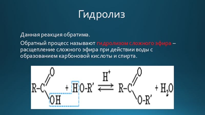 Обратный процесс называют гидролизом сложного эфира – расщепление