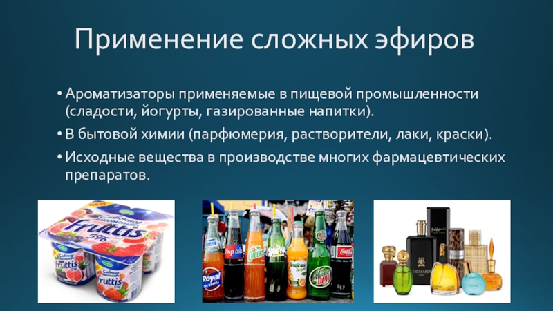 Применение сложных эфировАроматизаторы применяемые в пищевой промышленности (сладости, йогурты, газированные напитки).В бытовой химии (парфюмерия, растворители, лаки, краски).Исходные