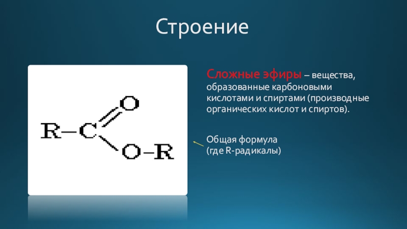 СтроениеСложные эфиры – вещества, образованные карбоновыми кислотами и спиртами (производные органических кислот и спиртов).Общая формула  (где
