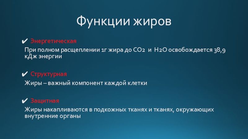 Функции жиров Энергетическая При полном расщеплении 1г жира до СО2 и Н2О освобождается 38,9 кДж энергии Структурная