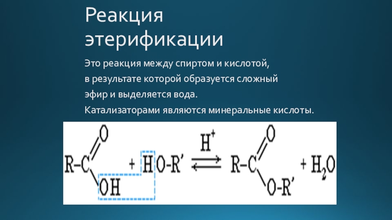 Реакция этерификацииЭто реакция между спиртом и кислотой,в результате которой образуется сложныйэфир и выделяется вода.Катализаторами являются минеральные кислоты.
