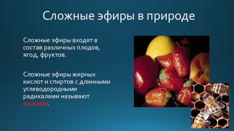 Сложные эфиры в природеСложные эфиры входят в состав различных плодов, ягод, фруктов.Сложные эфиры жирных кислот и спиртов