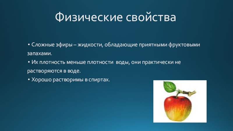 Физические свойстваСложные эфиры – жидкости, обладающие приятными фруктовымизапахами. Их плотность меньше плотности воды, они практически нерастворяются в