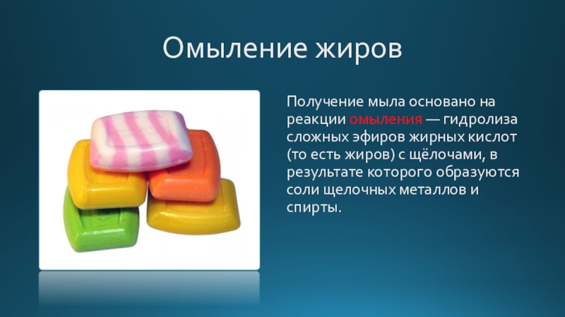 Омыление жировПолучение мыла основано на реакции омыления — гидролиза сложных эфиров жирных кислот (то есть жиров) с