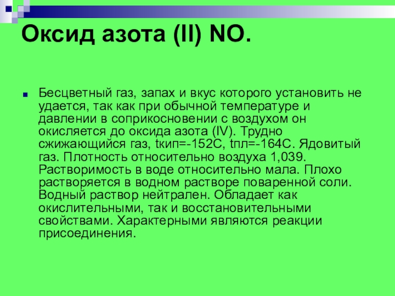 не удается, так как при обычной температуре и давлении в соприкосновении с воздухом он окисляется до оксида азота (IV). Трудно сжижающийся газ, tкип=-152С, tпл=-164С. Ядовитый газ. Плотность относительно воздуха 1,039. Растворимость в воде относительно мала. Плохо растворяется в водном растворе поваренной соли. Водный раствор нейтрален. Обладает как окислительными, так и восстановительными свойствами. Характерными являются реакции присоединения.