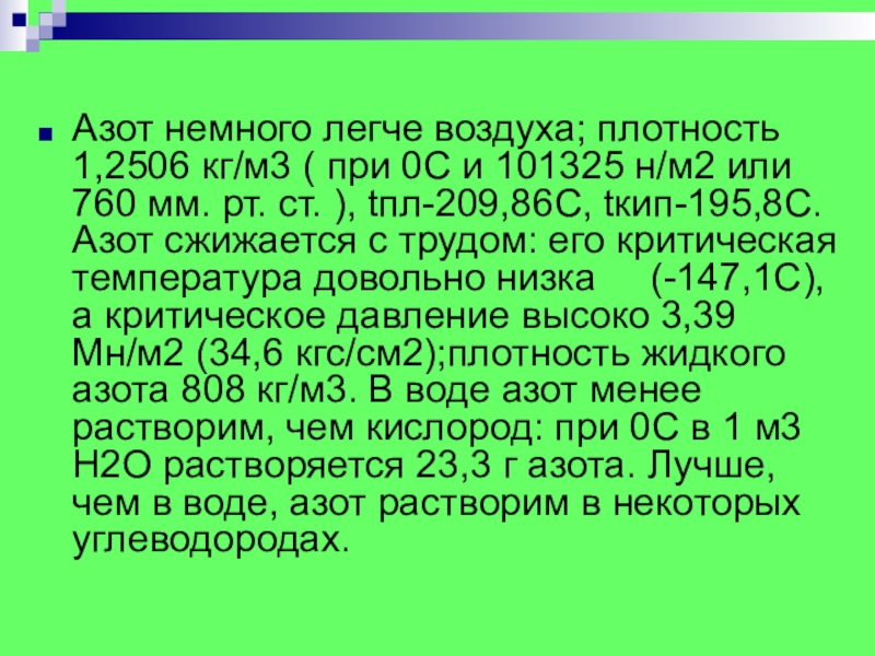 Слайд 4Азот немного легче воздуха; плотность 1,2506 кг/м3 ( при 0С и